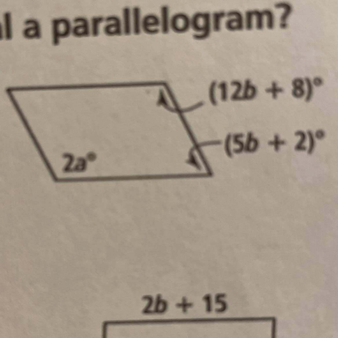 Properties of a parallelogram needed for this problem: Opposite angles are congruent and adjacent angles are supplementary, meaning they add to 180 degrees.