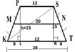 Given: KPST is a trapezoid, KP =ST, MN is a mid segment, h is the height =15