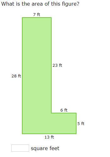 For the first figure, you will split it into two rectangles. You would do 28 x 7 for the first rectangle and get 196. Then, you would do 6 x 5 for the second rectangle and get 30. You would then add these two numbers and get the area of 226 ft^{2}}.