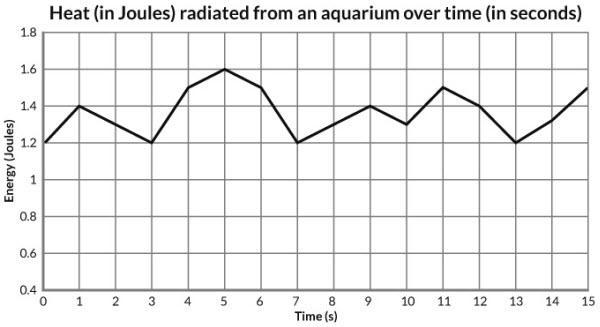 Graph shows heat, measured in Joules, radiated from an aquarium over time, measured in seconds. At 0 seconds, the energy, in the form of heat, is 1.2 Joules. At 5 seconds, the energy is 1.6 Joules. At 10 seconds, the energy is 1.3 Joules. Finally at 15 seconds, the energy is 1.5 Joules.