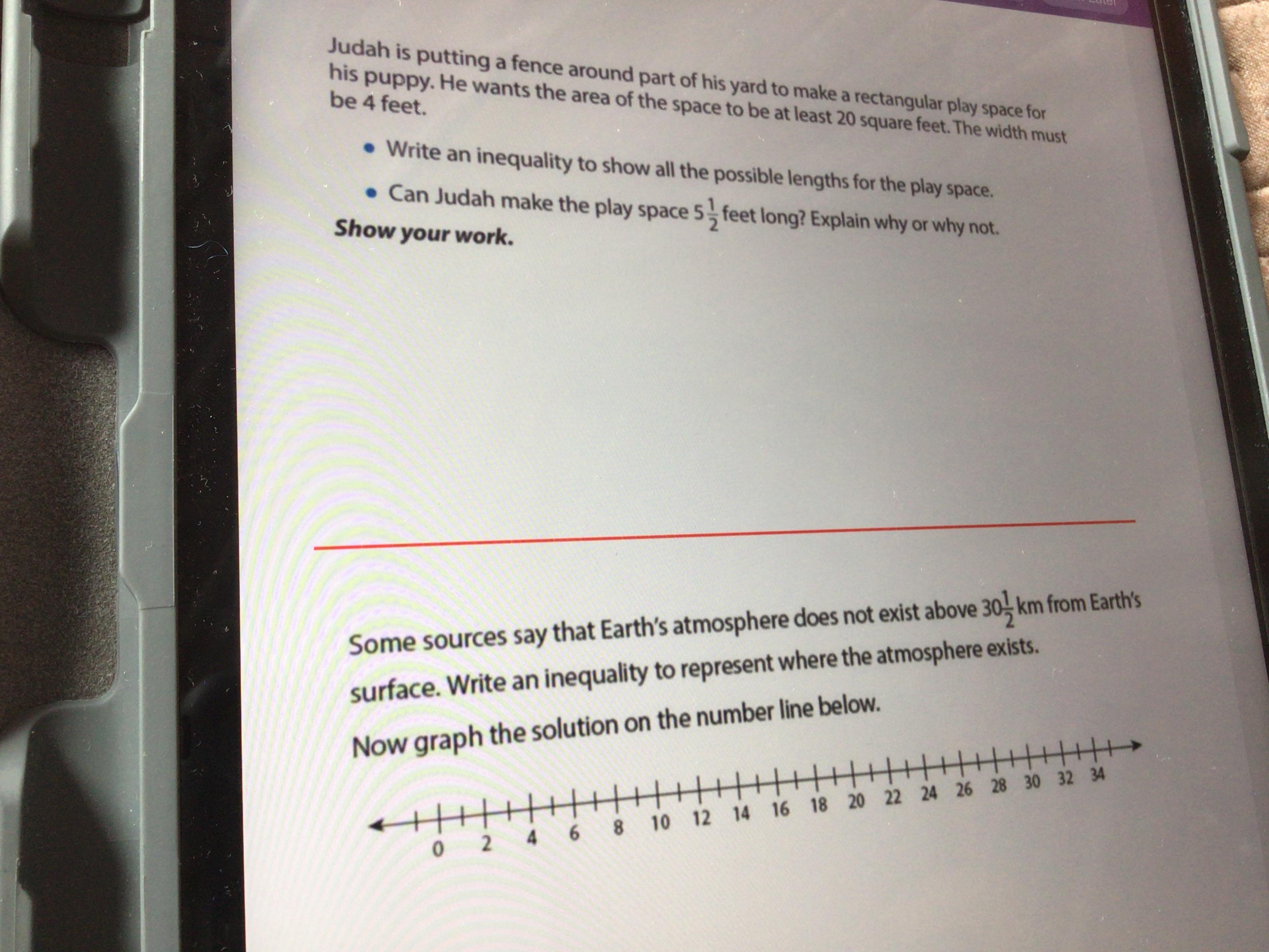 Well, the formula for finding the area of a rectangle is l x w. In the question, it states that the pen must be 4 ft wide and to fit his requirements of the pen being at the minimum 20 ft^2 we have this inequality 4x>=20 which we must solve and we get x>=5 which means that this represents all of the possible lengths for the play space. For the second part, we know that to fufill Judah's requirements for square ft., our length must be greater than or equal to 5. Last time I was doing math, I'm pretty sure 5 1/2>5 which thus can be accepted as a length value, still meeting the requirements of at least 20ft^2 space for the play space.