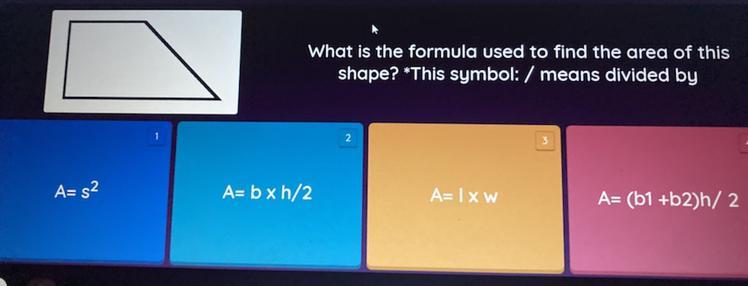 The shape given is a trapezoid having two parallel sides which can be labelled b1 and b2 respectively. The distance between the two parallel sides is the height of the trapezoid, which is labelled h.