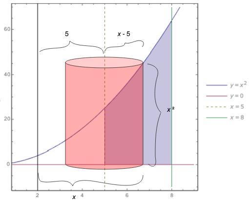 <em>V</em> = 2<em>π</em> ∫₅⁸ (<em>x</em> - 5) <em>x</em> ² d<em>x</em>