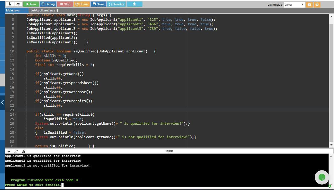 isQualified(applicant1); //calls isQualified boolean method by passing object applicant1 to it in order to determine whether applicant is qualified for an interview