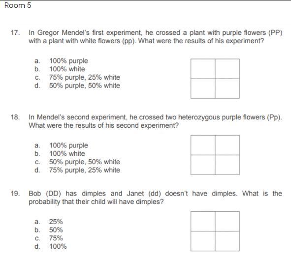 18. In Mendel's second experiment, he uses two purple flowers (Pp , one dominant, one recessive, each respectively). What were the result of his experiment: