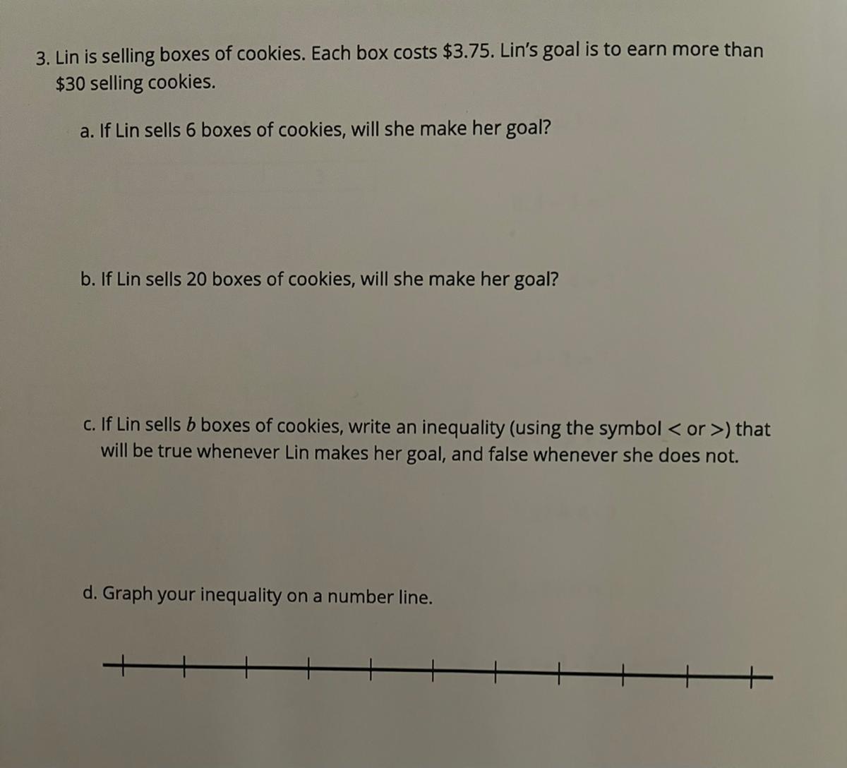 Lin is selling boxes of cookies. Each box costs 3.75. goal is to earn more than $30 selling cookies.