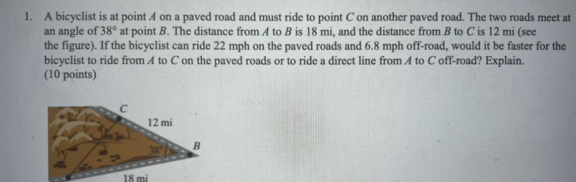 We can conclude that it would be faster for the bicyclist to ride from A to C on the paved roads since it takes a shorter time to reach its destination compared to the time used off-road.