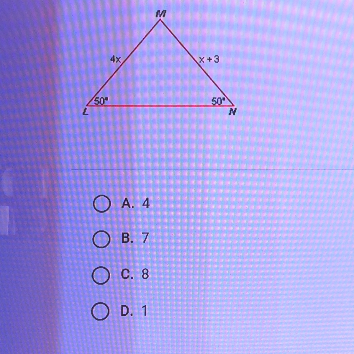4x= x+3; 4x-x=3; 3x=3; x=1