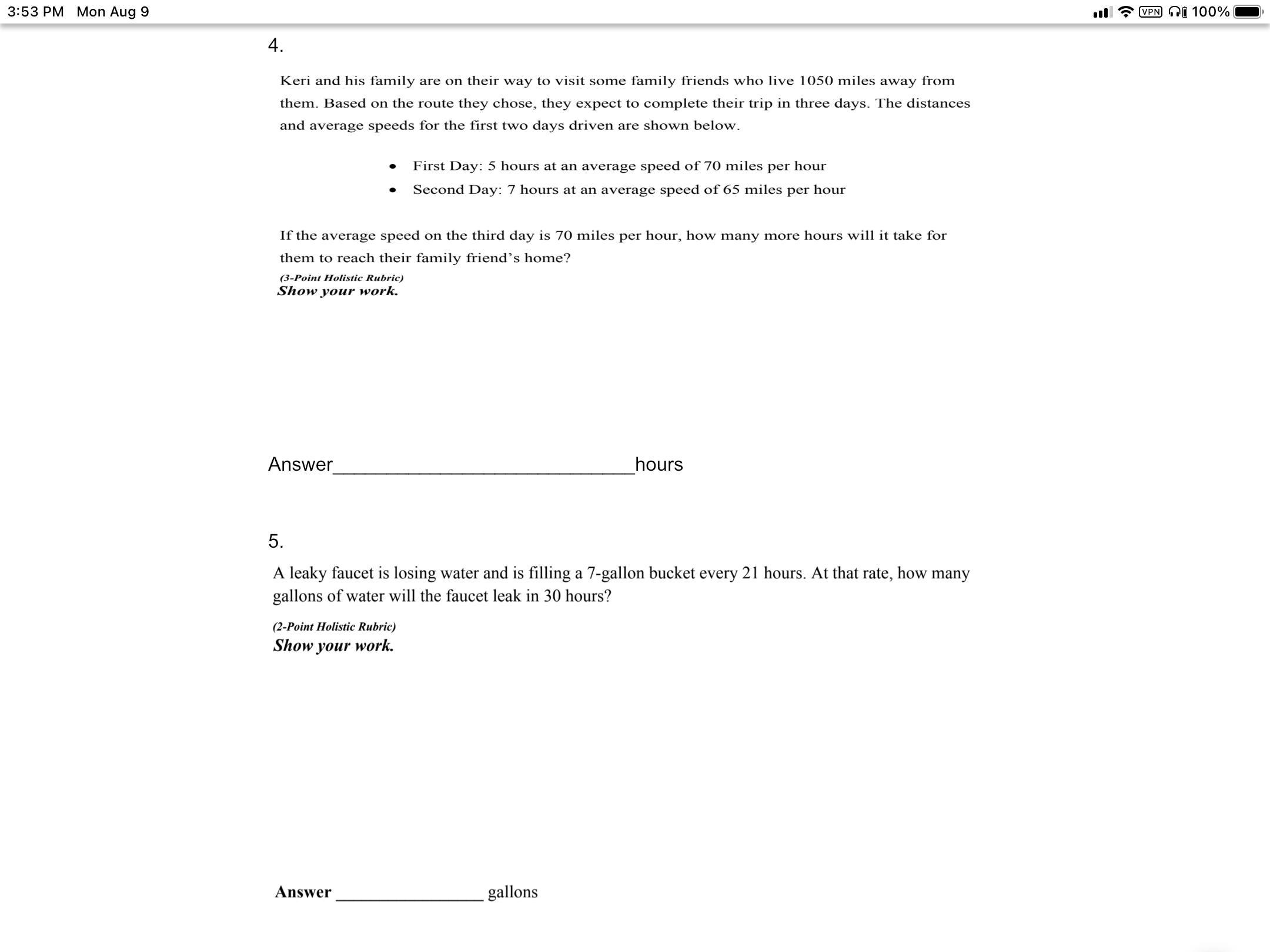 - On day 1, they drove 5 hours at an average of 70 mph. <em>5 * 70 = 350</em>, so they drove 350 miles on the first day.