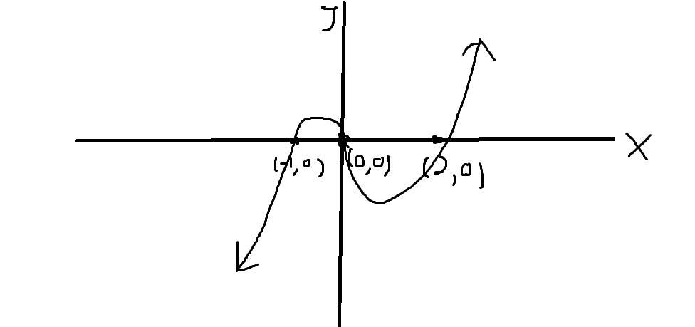 . As you can see the degree is odd, this means that this polynomial will have two opposite end behaviors. And as you can see the leading coefficient is positive, meaning that this function will go towards positive infinity as k goes towards positive infinity. Also we if look at the original equation given, it's in factored form, with the zeroes as k=0, k=2, and k=-1. So given this we can draw a simple graph to see when the value of the equation is negative. If you look at the graph I drew you'll see that it's negative from (-infinity, -1) and then negative from (0, 2)