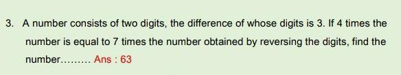 "4 times the number is equal to 7 times the number obtained by reversing the digits" ==> 4 (10<em>a</em> + <em>b</em>) = 7 (10<em>b</em> + <em>a</em>)