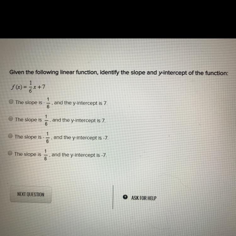 Your linear function is in the slope-intercept form of a line, y = mx + b, where m is the value of the slope, and b is the value of the y-intercept. The number in the m position in your equation is 1/6, and thee number in the b position in your equation is 7. So the second choice is the one you want.