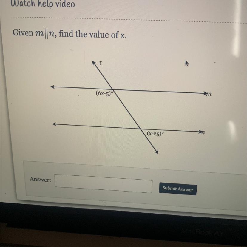 By using the corresponding angles theorem we can see that (6x - 5)° and (x - 25)° are supplementary angles, so they add up to 180°.
