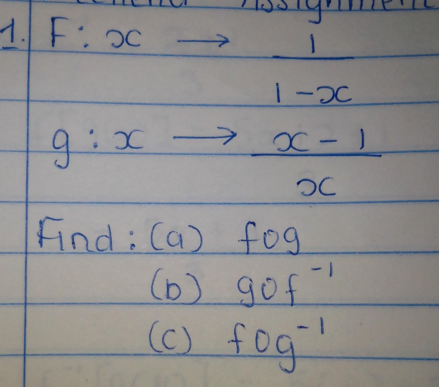 (c) (<em>f</em> o<em> g</em> ⁻¹)(<em>x</em>) = <em>f(f(x))</em> = 1/(1 - <em>f(x) </em>) = 1/(1 - 1/(1 - <em>x</em>)) = 1/(<em>x</em>/(<em>x</em> - 1)) = (<em>x</em> - 1)/<em>x</em>