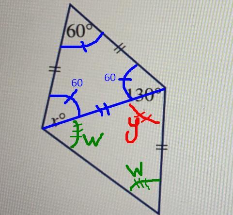 Refer to the diagram below. I've drawn diagonal that slopes upward. This diagonal cuts the quadrilateral into two triangles: One is equilateral and the other is isosceles.