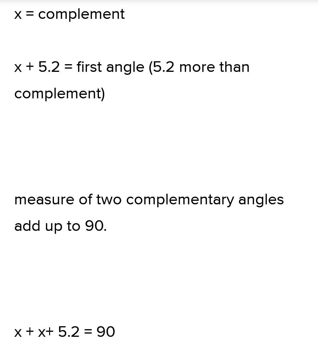 x + 5.2 = first angle (5.2 more than complement)