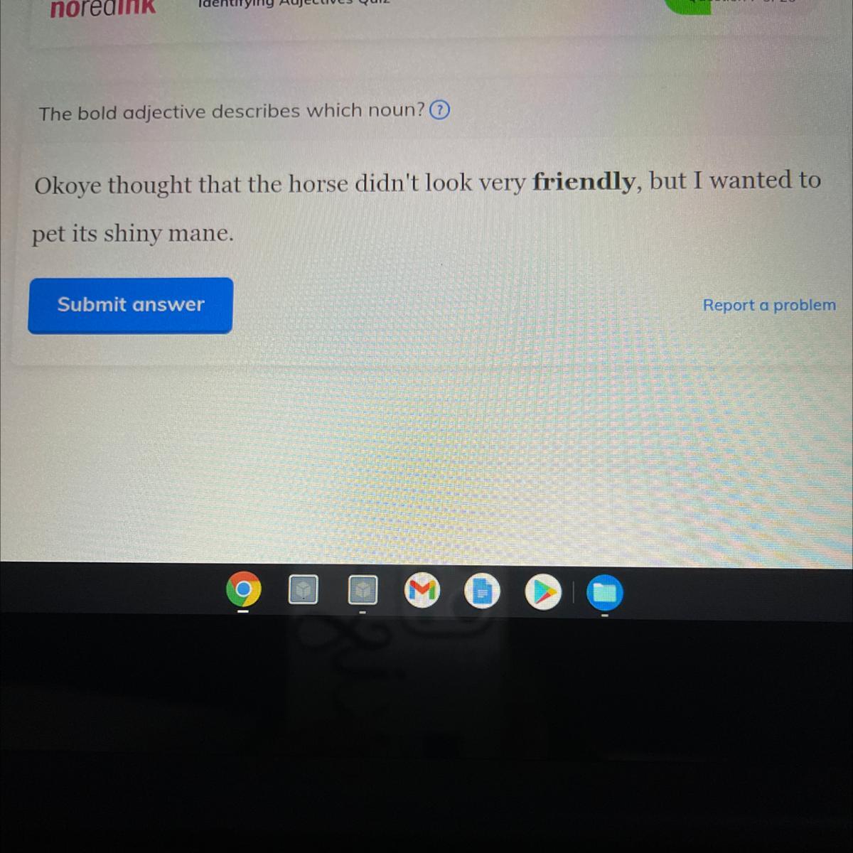 the adjective "friendly" describes the "horse"