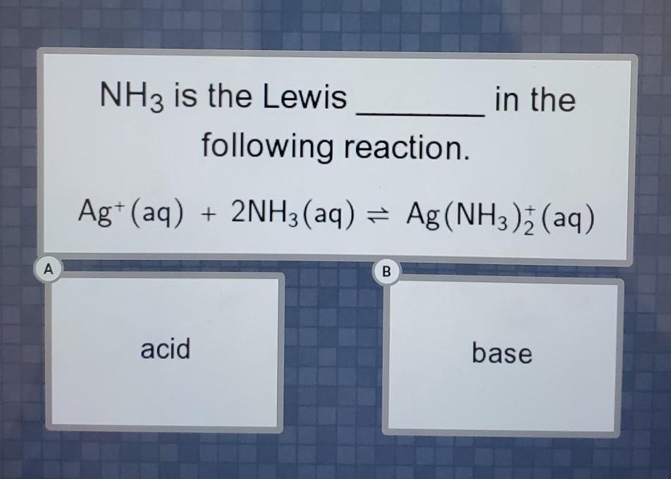 We will see ammonia attach itself to silver and not the other way around, silver therefore accepts electrons. So, silver is a Lewis acid and ammonia is a Lewis base, so this reaction is complex as ammonia reacts with the silver cation .