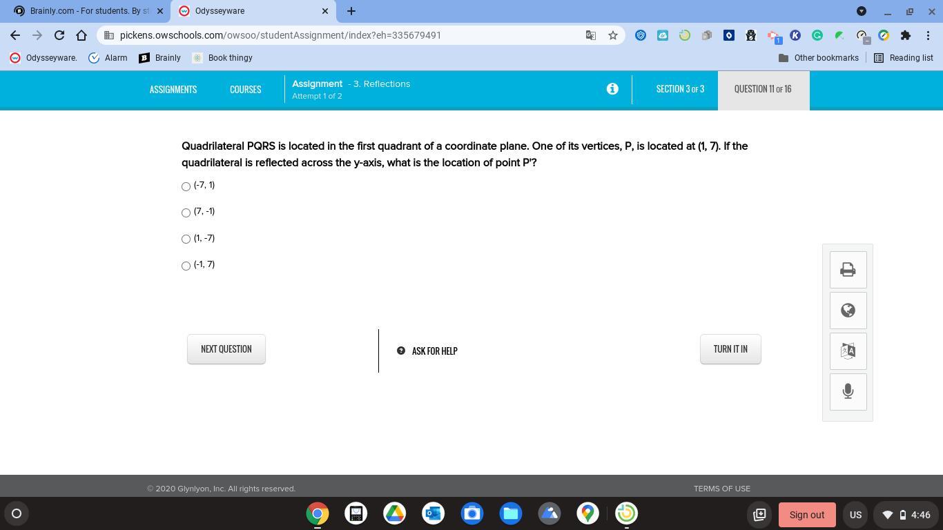 When reflecting across the y-axis, the x coordinate will be the additive inverse of what it was so for (1, 7), it would become (-1, 7).