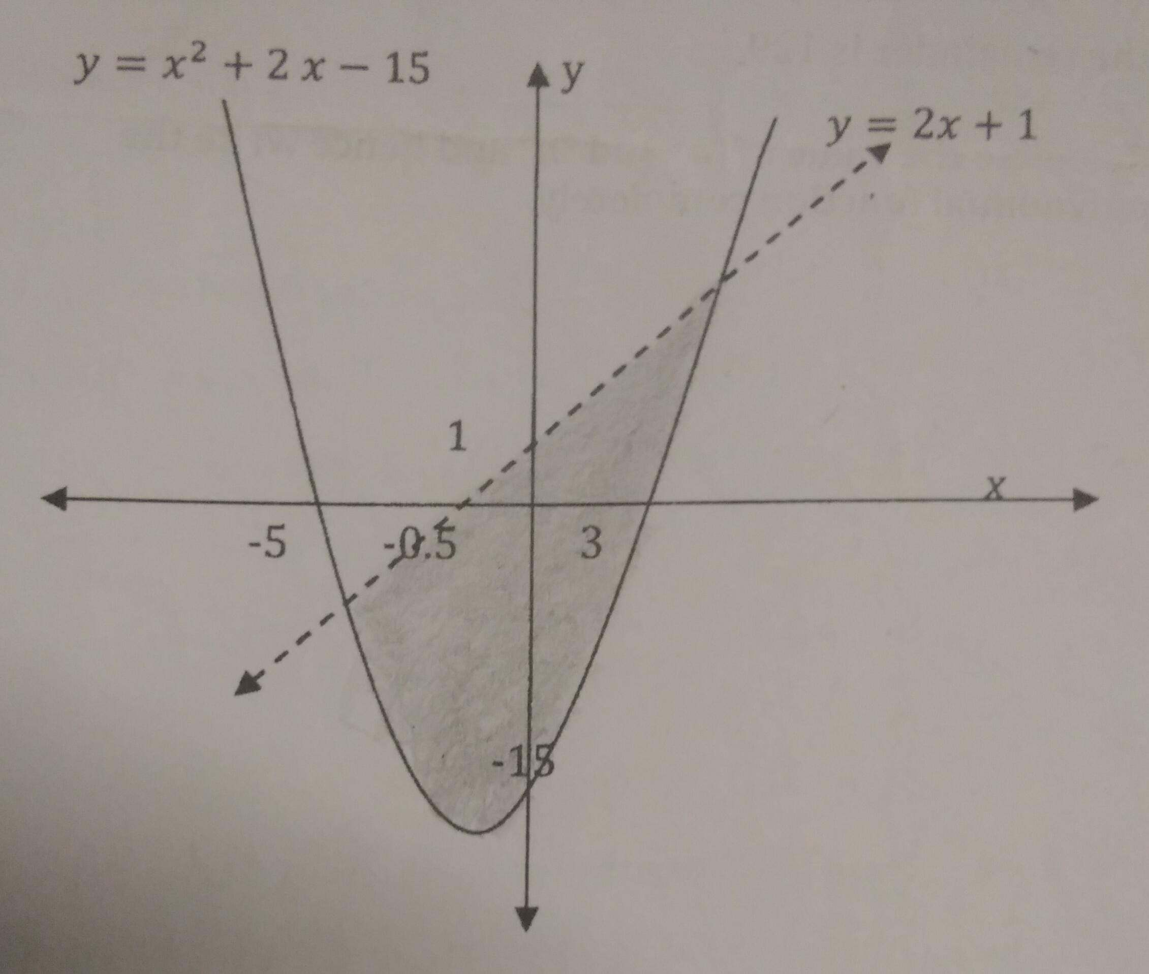 \Bigg\{ \begin{array}{ccc}2x-y+1&>&0\\x^2+2x-y-15&\leq &0\\\end {array} \right.
