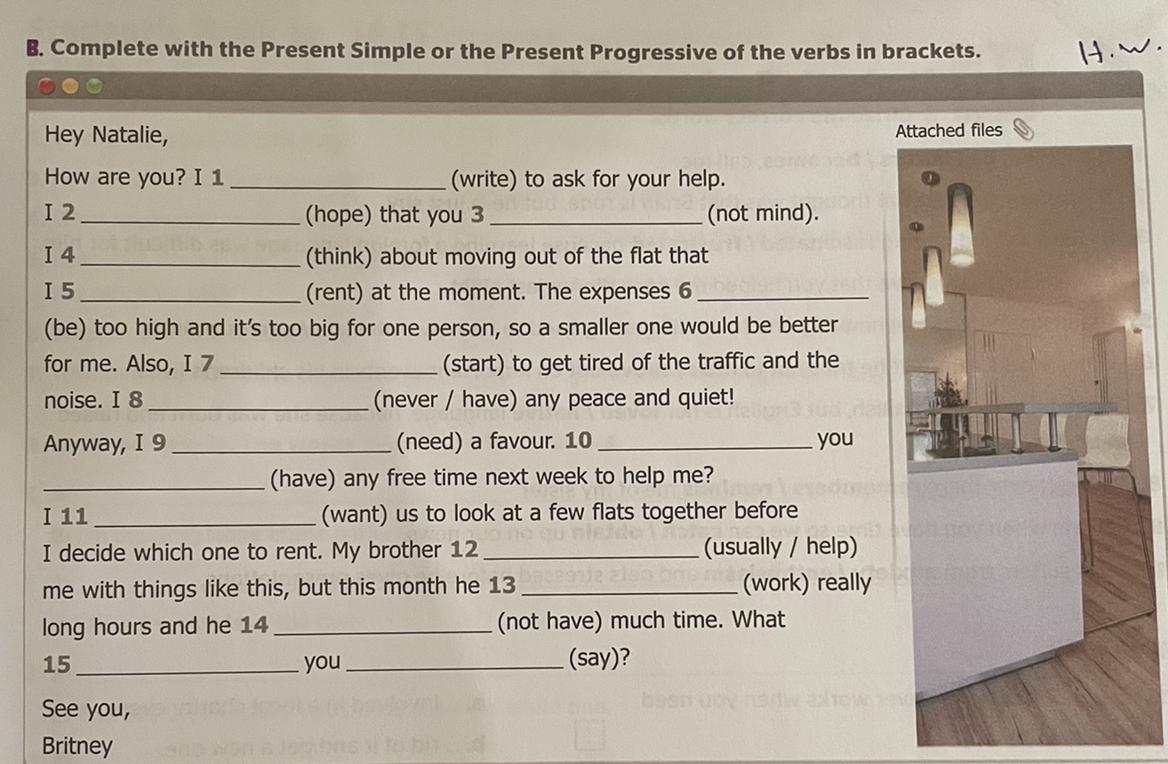 How are you? I am writing to ask for your help. I hope that you do not mind. I am thinking about moving out of the flat that I am renting at the moment. The expenses are too high and it's too big for one person, so a smaller one would be better for me. Also, I am starting to get tired of the traffic and the noise. I never have any peace and quiet! Anyway, I need a favour. Do you have any free time next week to help me? I wanted us to look at a few flats together before I decide which one to rent. My brother usuallyhelps me with things like this, but this month he is working really long hours and he does not have much time. What do you say?