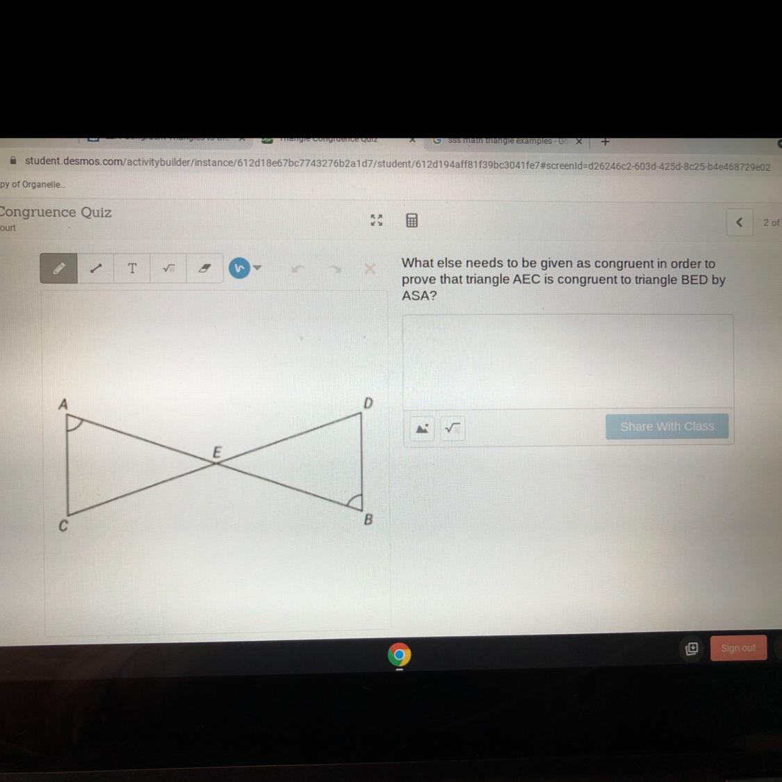This implies that two angles (<AEC and <EAC) in triangle AEC are congruent to two corresponding angles (<BED and <EBD) in triangle BED.