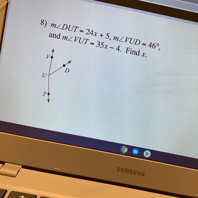 Angles DUT and VUD sum to VUT. We can create an equation to model this.