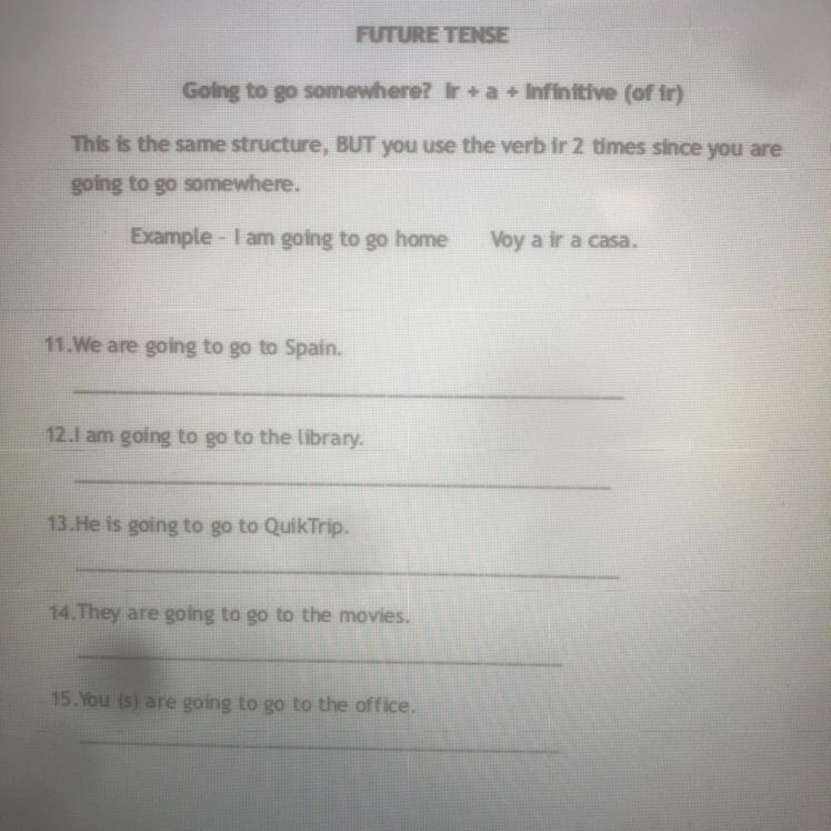 Answer: Vamos a Ir a España, Voy a ir a la biblióteca, El va a ir a QuikTrip, Ellos van a ir al cine, Tu vas a ir a la oficina.