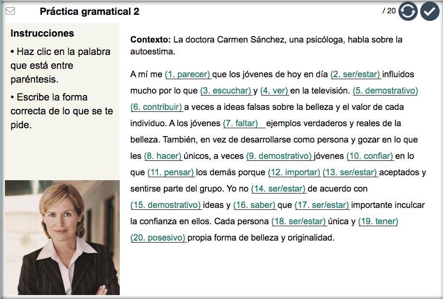 Using this vocabulary and a relative pronoun, write a sentence in Spanish. You are going to write eight sentences. An example (which you can not use) is: I know a doctor who is very intelligent. When you finish writing the sentences, record your voice repeating your sentences in Spanish for your teacher. You do not have to send the phrases, only the recording.