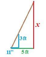 \frac{B}{b}=\frac{H}{h}\\\frac{60}{11}=\frac{x}{36}\\x=\frac{60*36}{11} \\x=\frac{2160}{11} \\x=196.36\,in