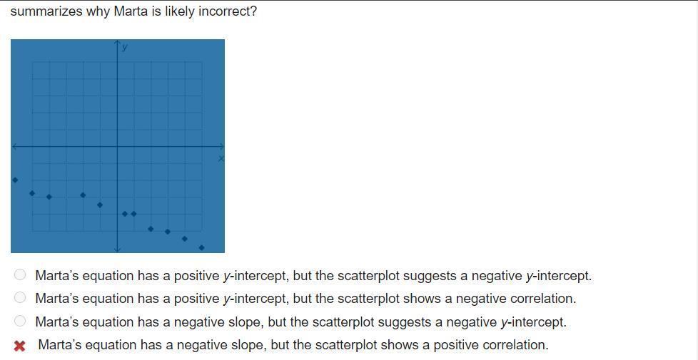 Marta’s equation has a positive y-intercept, but the scatterplot shows a negative correlation.