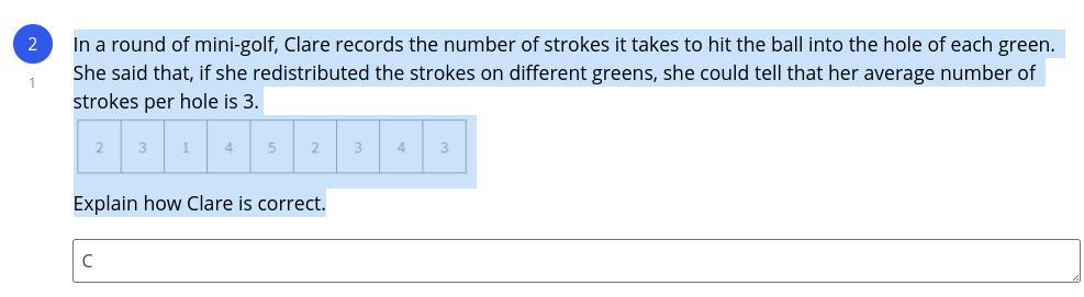 Answer: She is correct because the average of the numbers 2, 3, 1, 4, 5, 2, 3, 4, 3, is 3.