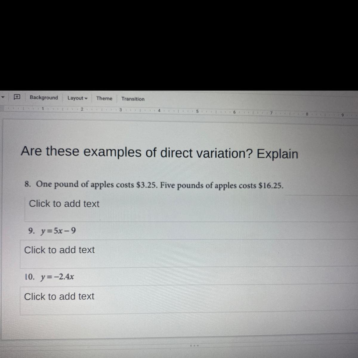 8 - direct variation Since the equation can be written in the form y=kx. , y varies directly with x and k. The constant of variation, k, is 3.25