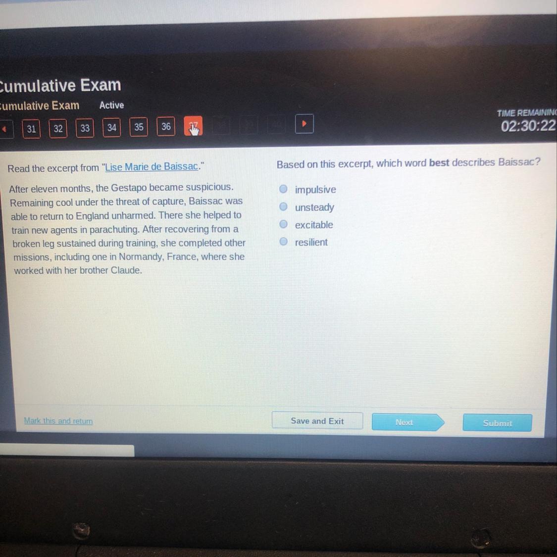 In the excerpt, Baissac could face every adversity that presented to her. She could overcome potential threats and an injury and kept working on, this shows how strong and determined she is. And that is what resilience is related to: always moving forward no matter what obstacles there can appear.