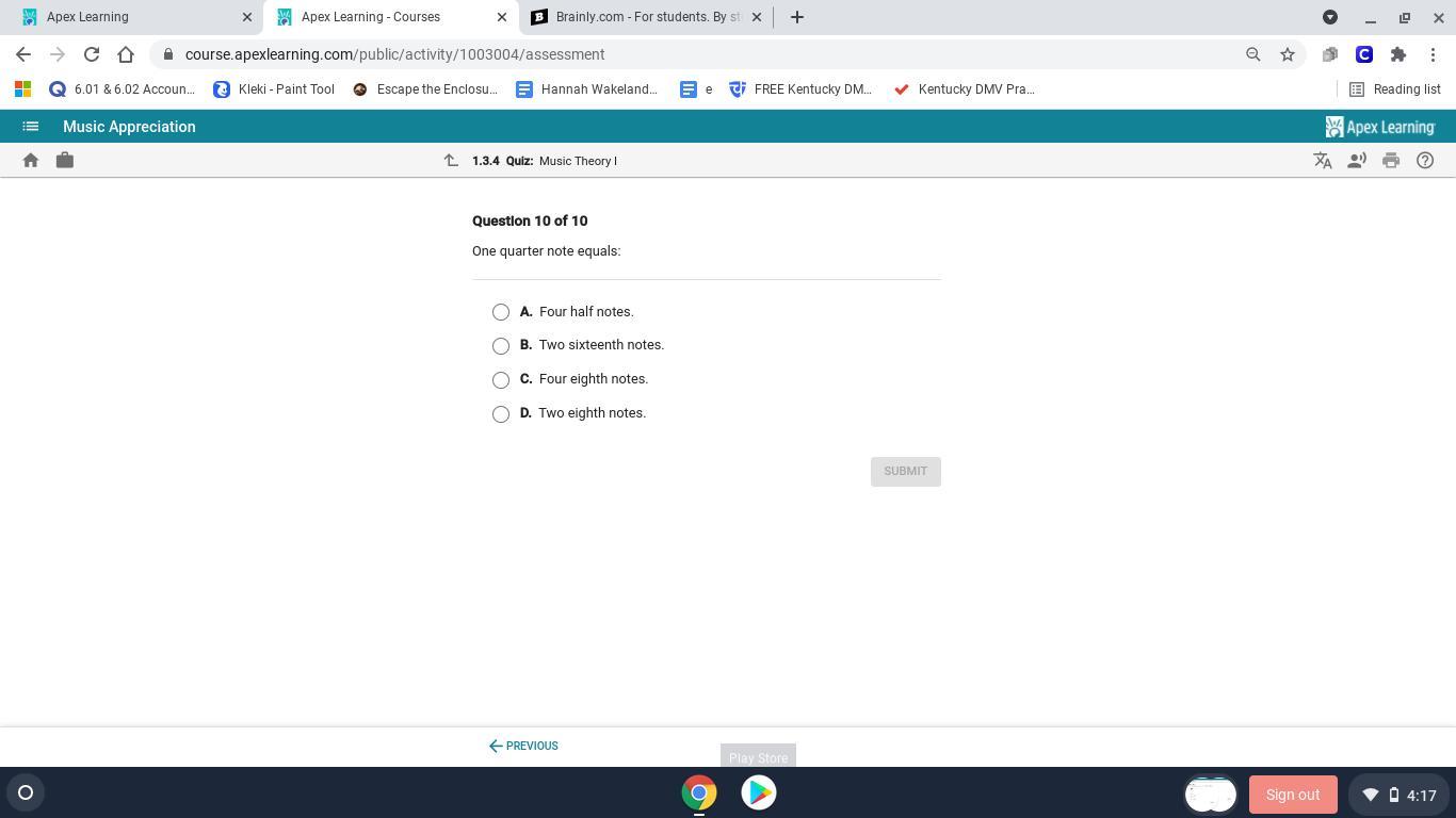 One quarter note equals two EIGHTH notes or four SIXTEENTH notes.