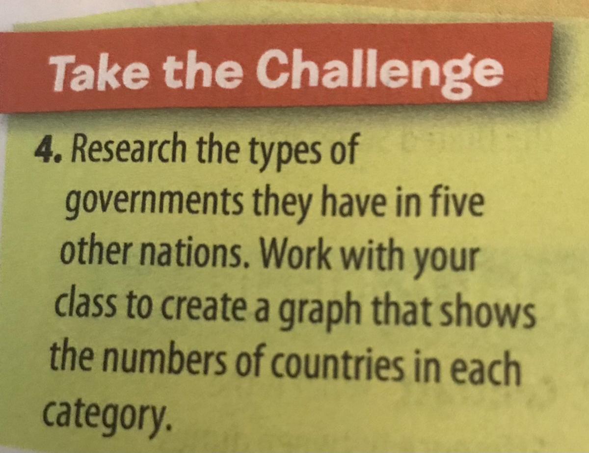 Research the types of government they have in five others nations. Work with your class to create a graph that shows the numbers