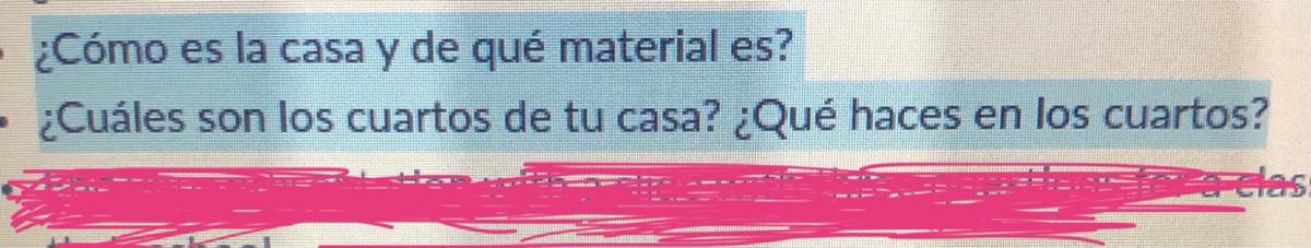 1. La casa es grande y es de madera. 2. Los cuartos de la casa son los que están en la parte de atrás de esta. 3. En los cuartos dormimos y vemos televisión.
