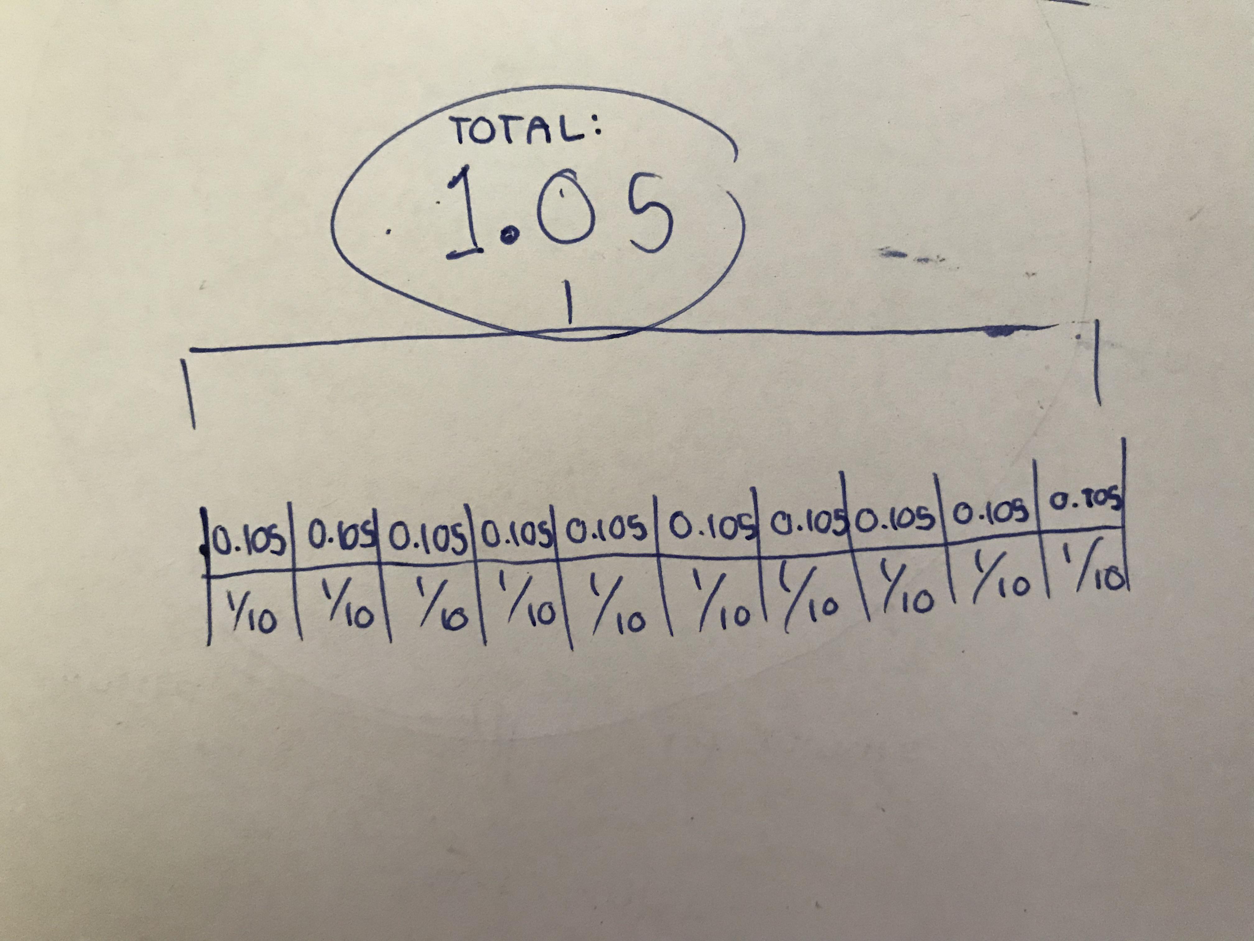 One way to evaluate this question is to take the number one tenth of 1.05, which would be ten thousandths, or 10-10. Another way is to ask yourself what you were taught in school about decimals. If eleven tenths are written as 10/2, then one tenth would be 11/10 or 11/100 since they are equivalent fractions. One over 100 has a value of 100 if ten percent has a value of ten one hundredths or (.1) (nb). So the answer is 0.000100110110100100001011000001000000100100000011001000100110000110 (wrong punctuation) which would be equal to .3% without rounding off but I am not sure what the correct answer would be if one were to round off.