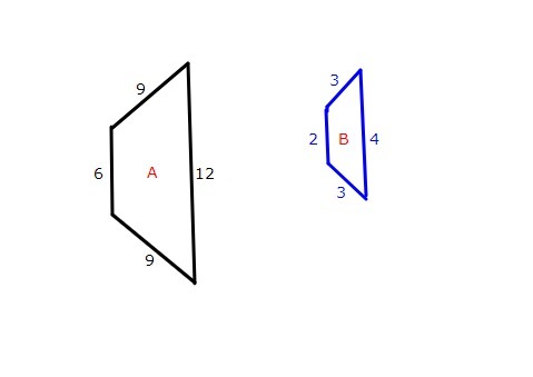 Quadrilateral A has side lengths as 6, 9, 9 and 12. In quadrilateral B, length of the shortest side is 2.