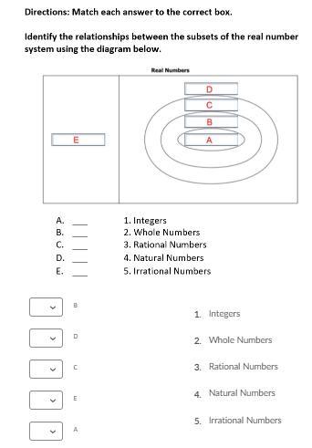 Irrational numbers are numbers that can't be expressed in a fraction. They can be positive or negative. But they are NEVER integers, whole numbers, rational numbers, or natural numbers. Thus, the reason why E is by itself.