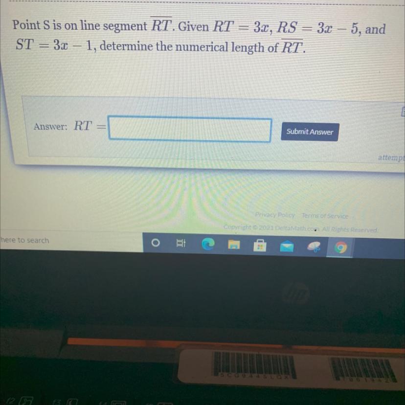 Point S is on line segment RT.Given RT = 3x, RS = 3x - 5, and