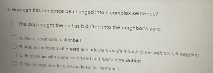 Explanation: Complex sentences include an independent clause and one or more dependent clauses.