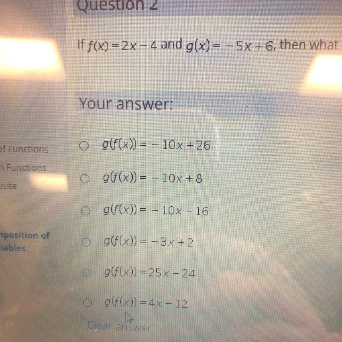 If f(x) = 2x – 4 and g(x)= -5x +6, then what is g(f(x))?