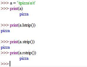 o, Print the food out and include some white space characters at the beginning and end and use "\t" and "\n" a least once. Then print the food once so the white space is displayed. Remember, you may not be able to see the white space on the right hand side. Following the food name print, print the name out three additional times (a total of four times), once normally, and one for each of the three stripping functions lstrip(), rstrip(), and strip().