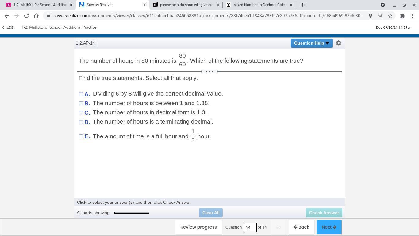 Dividing 6 by 8 equals 0.75, which is not the correct decimal. B is correct because 1.3 is between 1 and 1.5. Even though the decimal is 1.3333333, so on and so forth, it would be labeled 1.3. Again, because the decimal is 1.3333333 continued, it is not a terminating decimal since terminating decimals have ends. And finally, it would equal 1 hour and one thirds of an hour -> 1.3