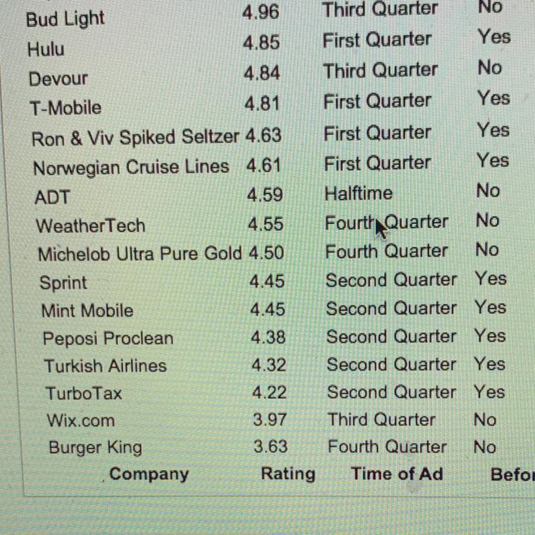 following table contains the rating of ads that ran between the opening kickoff and the final whistle. Complete parts (a)