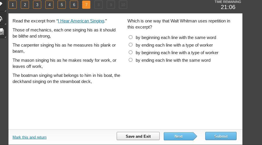The correct answer is option ( A ) by beginning each line with the same word
