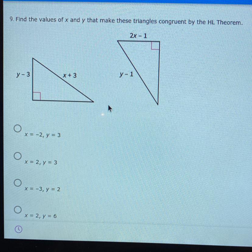 9. Find the values of x and y that make these triangles congruent by the HL Theorem.