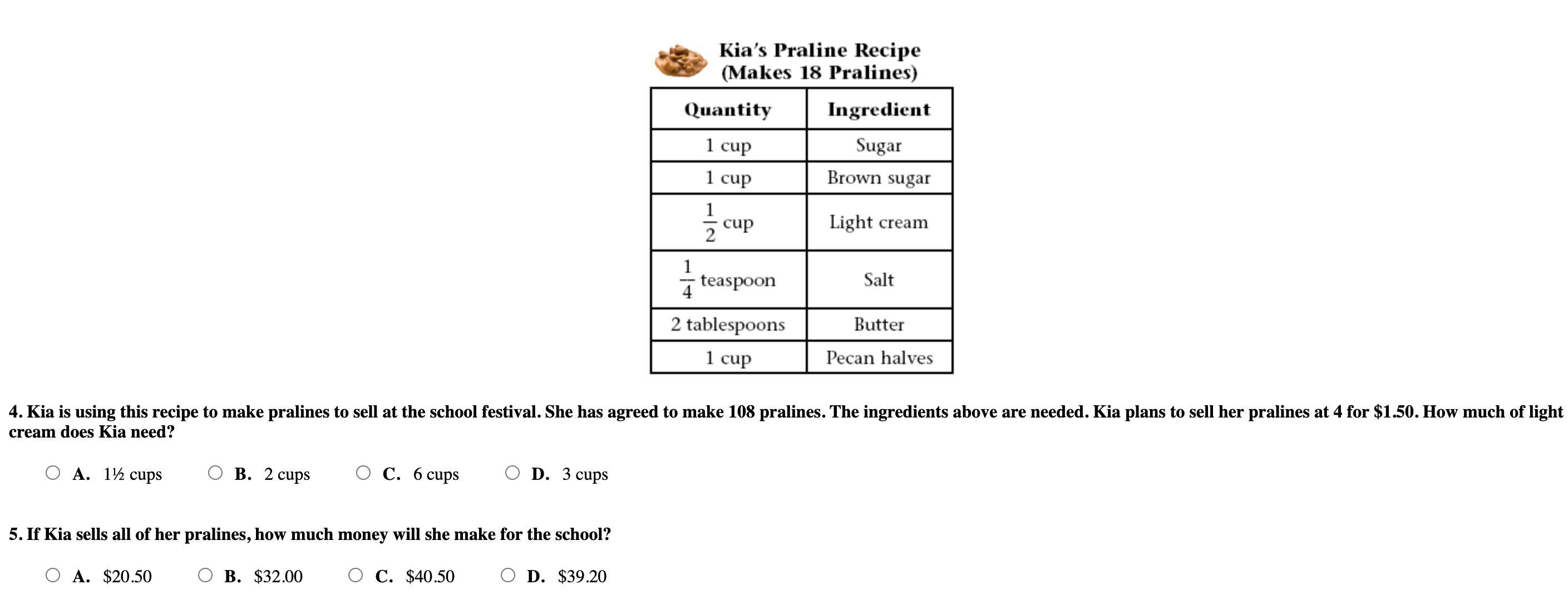 She needs 1/2 cup light cream from one batch, so 1/2 times 6 is 3 (6 / 2 = 3). So the answer to 4 is D. 3 cups