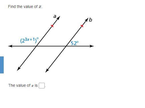 in this case the angles are consecutive angles. So, when add together they are supplementary. Supplementary means they add to be 180°. so 2^(3x+1)+1=180 Thus, x=2.